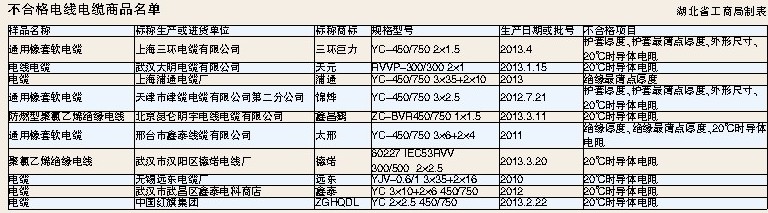湖北省工商局近日通报了对流通领域电线电缆质量的监测结果,“三环巨力”橡套软电缆、“鑫昌鹤”聚氯乙烯绝缘电线、“浦通”电缆、“远东”电缆等标称品牌商品上黑榜。