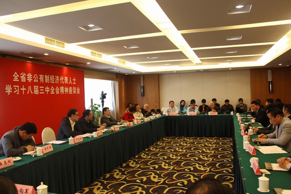 11月22日下午,江苏省非公经济代表人士学习党的十八届三中全会精神座谈会在南京国际会议中心举行。省人大常委会副主任、省工商联主席许仲梓,省统战部副部长、省工商联党组书记邵军,全国工商联副主席、省商会副会长、红豆集团党委书记、总裁周海江,省工商联巡视员庞辉,省工商联副主席桂德祥,省政协副秘书长、省工商联副主席陆群,省工商联副主席姜成林,省工商联副主席、苏宁环球集团董事长张桂平,省工商联副主席、远东控股集团党委书记、董事局主席蒋锡培等参加座谈会。