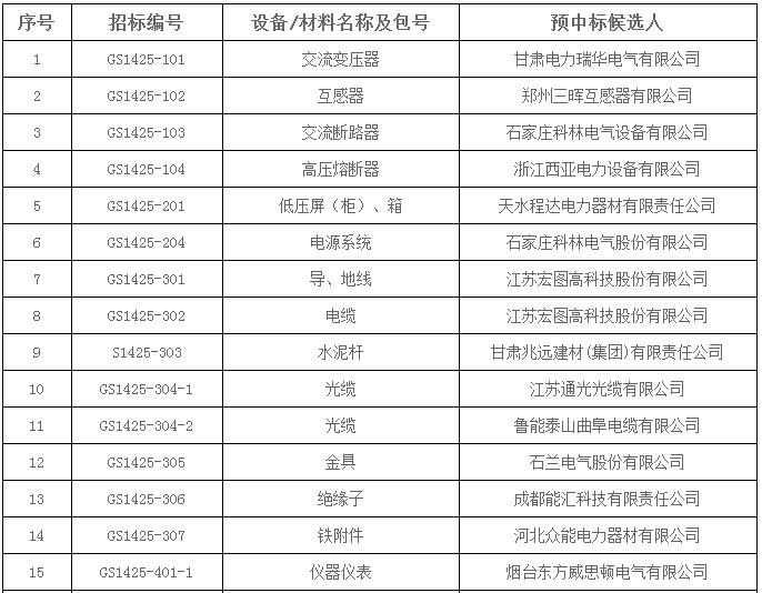 国网甘肃电力2014年第五批县供电公司物资招标采购项目中标公示