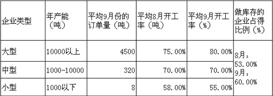 订单方面:9月份万吨以上的调研样本中铝加工企业平均订单量约4500吨,千吨以上的铝加工企业平均订单为320吨;而千吨以下的铝加工企业平均订单仅有8吨。此次调研企业中小企业的订单量有小幅下滑,而大中企业的平均订单量却呈小幅增长;究其原因是个别企业的订单量增幅较大拉动了平均数据。因为据了解,8成以上的企业表态9月的开工订单没有明显上涨,能维持现状不减少都已经是很不错的了。可见并没有出现"金九"的销售旺季。