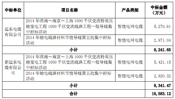 近期,国家电网公司电子商务平台(http://ecp.sgcc.com.cn )公示了国家电网公司 2014 年淮南~南京~上海 1000 千伏交流特高压输变电工程 1000 千伏交流线路工程一般导线集中招标活动等项目中标人名单,公司子公司远东电缆有限公司、新远东电缆有限公司为项目中标人之一,中标情况如下。