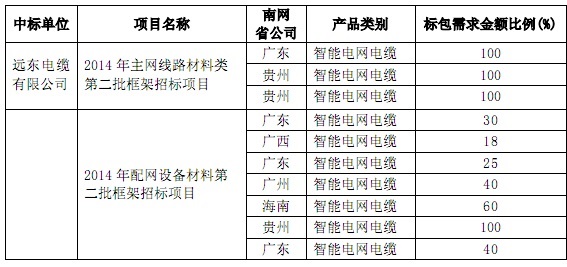 近期公司收到中国南方电网有限责任公司中标通知书,公司子公司远东电缆有限公司中标南方电网公司 2014 年主网线路材料类第二批框架招标等项目,中标情况如下。