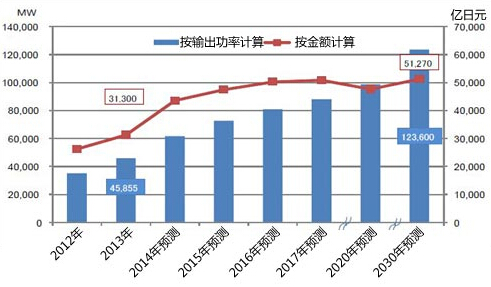 设想到2030年,市场规模按输出功率计算将达2013年的2.7倍,为123.6GW,按金额计算将扩大到2013年的1.6倍,为51270亿日元。