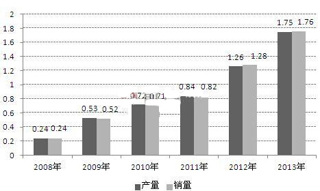 2008-2013年,我国新能源汽车销量逐年增长,年复合增长率约为28.05%。2013年,我国新能源汽车销量约为1.76万辆,同比增长37.60%。