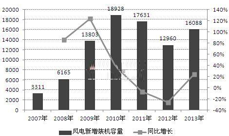 2007-2010年,我国新增装机容量逐年上升,2011-2012年有所下滑,2013年,中国(不包括台湾地区),新增装机容量16088MW,同比增长24.14%;累计装机容量91412MW,同比增长21.36%。新增装机和累计装机两项数据均居世界第一。