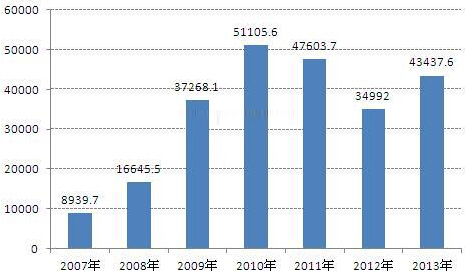 2007-2013年中国光伏发电领域薄膜电容器产值(单位:万元)