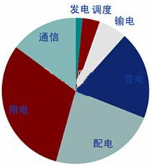 由上图可以看出,用电环节占智能化投资的比重最高,达到30.8%,主要是用电信息采集等项目的建设规模大,因而投资较大。其次是配电环节占23.2%,变电环节占19.5%,主要由于配电智能化、智能变电站新建和改造等项目的建设规模大。