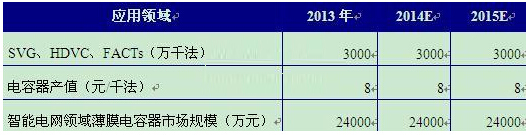 从智能电网投资情况可以预测,2013-2015年,智能电网领域薄膜电容器市场规模均约为2.4亿元。