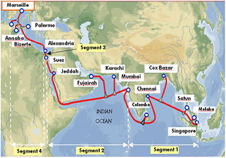此外,该地区目前还拥有一条类似的海缆系统,东南亚-中东-西欧4号海缆系统(SEA-ME-WE4),是由16家电信企业联合建设的,已于2005年12月投入使用,总耗资约5亿美元(约合人民币30.6亿元)。不过,东南亚-中东-西欧5号海缆系统总投资额还未公布。