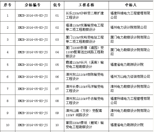 “总部统一组织监控,省公司具体实施”国网福建省电力有限公司第五批工程服务类项目的中标候选人公示已结束,现将中标结果公告如下: