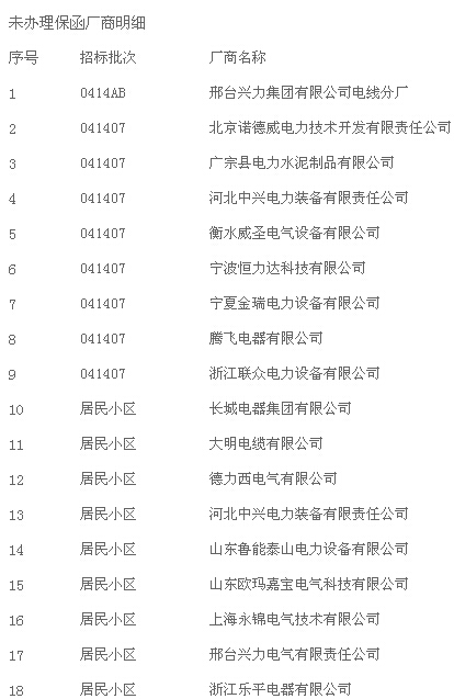 为促进供应商保证产品质量和诚信履约,依据《国网河北省电力公司对供应商签约、履约行为要求》的有关规定,国网河北省电力公司供应商服务中心对2014年10月份供应商未及时交履约保函的情况进行了统计,通报如下: