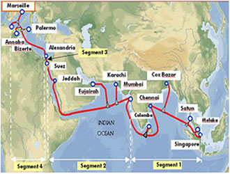Sea-Me-We4海缆系统是连接马六甲与东南亚、西亚、欧洲西部的海底光缆网络,施工周期18个月,于2005年建成投产。总跨度2万公里,途径14个国家,包括新加坡、马来西亚、泰国、孟加拉、斯里兰卡、印度、巴基斯坦、阿联酋、沙特、埃及、突尼斯、阿尔及利亚、意大利以及法国。