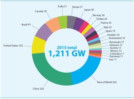 从国家来看,与太阳能和风能一样,中国毫无悬念地成为全球最大的水电国家,累计装机容量已经达到320吉瓦,包括2015年新增的19.4吉瓦。中国的水电市场更是对全球水电市场的发展起到积极的作用。中国长江三峡公司已经成为巴西第二大私有发电企业。同样地,中国的水电行业也影响非洲多个国家,包括埃塞俄比亚、几内亚和赞比亚等。