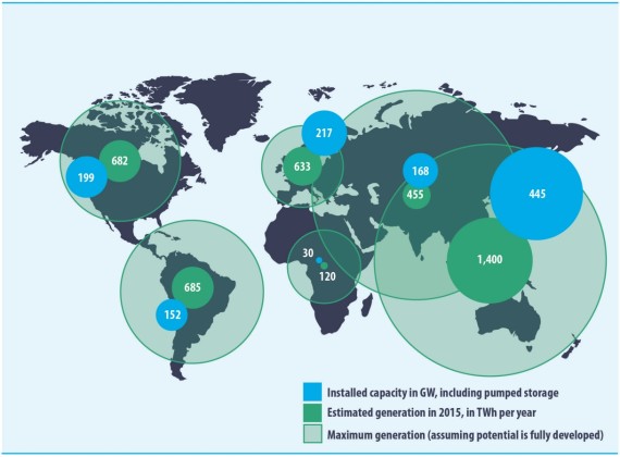 国际水电协会还透露,截止2015年,全球水电累计装机容量已经达到1211吉瓦,其中包括145吉瓦抽水蓄能容量。
