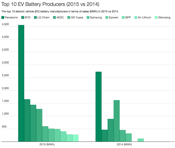 LG Chem以年销售量1432兆瓦时排在第三位,同比增长61.6%,其全球市场份额与2014年持平,达到12%。LG Chem是雪佛兰Volt混合电动汽车的电池供应商,也是即将上市的Bolt电动汽车电池供应商。