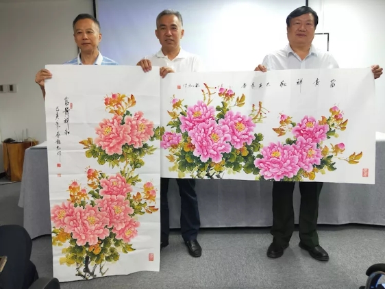 三家会长互赠礼物合影留念