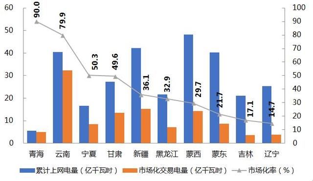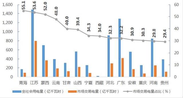 分省来看,市场交易电量占全社会用电量比重排序前三名的省区是青海(55.1%)、江苏(53.6%)、蒙西(52.0%);电力市场交易电量规模排序前三名的省区分别是江苏(799亿千瓦时)、广东(415亿千瓦时)和山东(400亿千瓦时);省间外受电市场交易电量排序前三名的省区分别是江苏(123亿千瓦时)、广东(116亿千瓦时)、和山东(97亿千瓦时)。