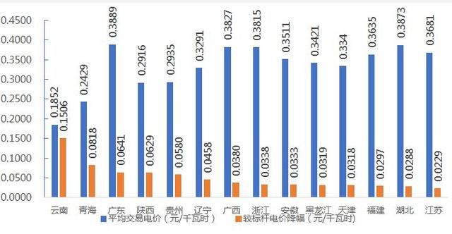 从分省煤电交易价格来看,与标杆电价比较降幅超过0.1元/千瓦时的省份是云南省,其市场交易平均电价分别为0.1852元/千瓦时与标杆电价相比降幅为0.1506元/千瓦时。其次,降幅超过0.05元/千瓦时的省区有青海、广东、陕西和贵州,其交易平均电价分别为0.2429元/千瓦时、0.3889元/千瓦时、0.2916元/千瓦时、0.2935元/千瓦时。