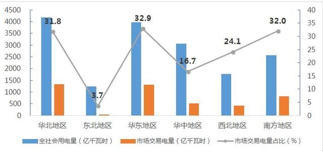 分区域市场来看,华北、华东区域市场交易电量规模分别为1330亿千瓦时、1308亿千瓦时,两个区域的市场交易电量规模占全国市场交易电量的比重达到了60%。华东、南方、华北三个区域的全社会用电量市场化率都超过了30%。