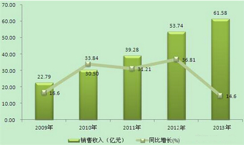 近几年由于行业产品的应用领域越来越广泛,我国薄膜电容器行业获得了快速的发展。2013年,市场规模达到61.58亿元,同比增长14.6%。
