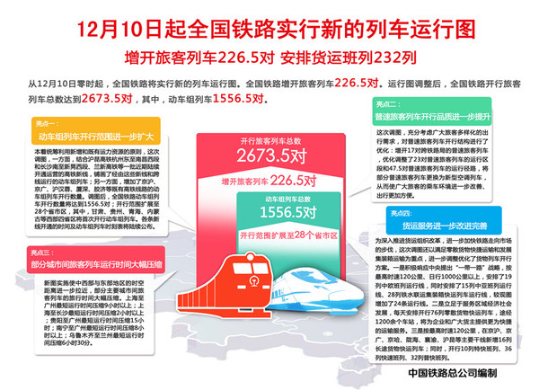 从中国铁路总公司获悉,为充分体现铁路建设加快推进的成果,更好地发挥铁路在综合交通体系中的骨干作用,实现让广大旅客“安全出行、方便出行、温馨出行”的目标,从2014年12月10日零时起,全国铁路将实施新的列车运行图。这是今年7月1日调图后,中国铁路总公司对列车运行图进行的又一次较大调整。这次调图后,全国铁路旅客列车开行总数将达到2673.5对,比调图前增加226.5对。与现在的运行图相比,新的运行图主要有以下变化: