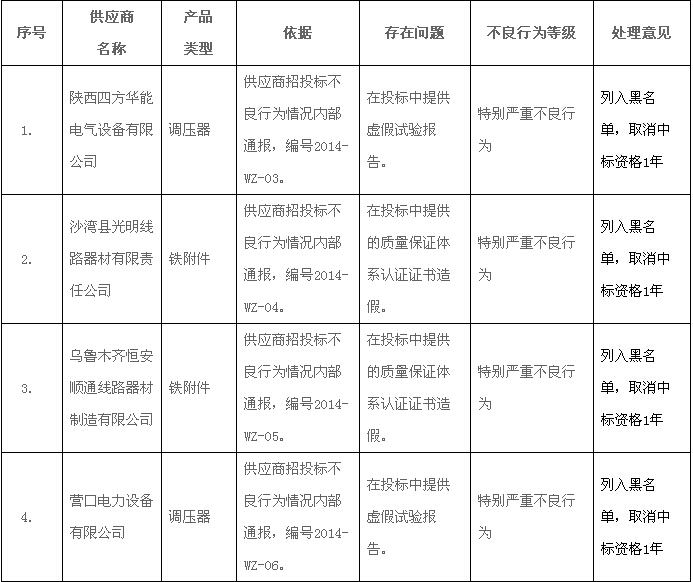 国网新疆电力公司关于供应商不良行为的处理意见,列入黑名单的企业(见如下表格)