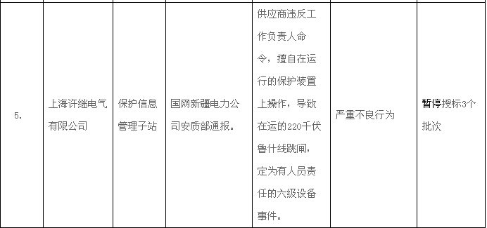 烟台东方电子玉麟电气有限公司:在合肥公司110kV十八岗变电站智能化改造工程中,该供应商供应产品存在质量隐患,该供应商不及时配合进行整改,影响现场安全运行。。对其处罚措施为: