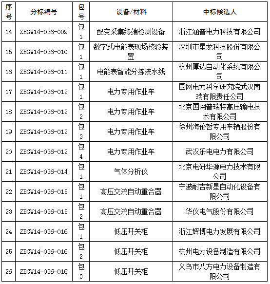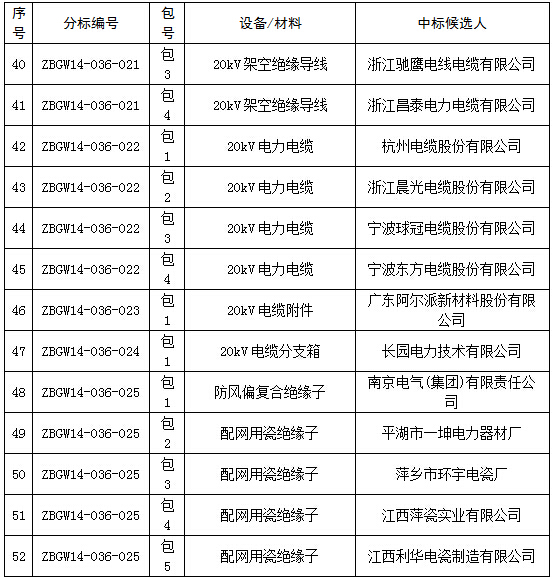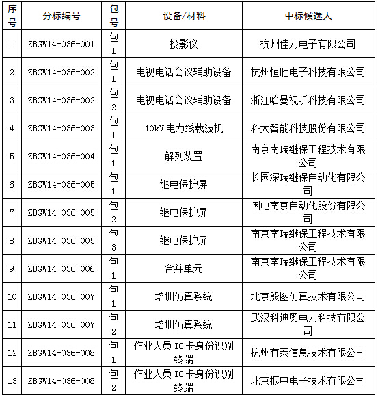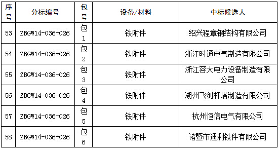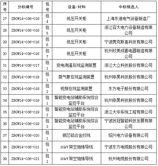 国网浙江电力2014年第五批设备、材料中标公示