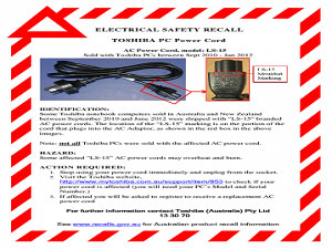 近日,东芝正在召回其标签为“LS-15”的交流电电源线。这些电源线是于2010年9月至2012年6月随其笔记本电脑销售出去。这次召回电源线是因为产品可能过热并引起燃烧。