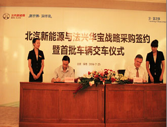 7月25日上午,北汽新能源与世界第二大汽车租赁公司法兴华宝签订采购签约暨首批车辆交付仪式。凭借过硬的产品实力和良好的口碑,北汽新能源成为法兴华宝中国区首个新能源汽车租赁业务供应商。此次交付的20辆E150EV纯电动车交车也是北汽新能源在国务院颁发《关于加快新能源汽车推广应用的指导意见》以来,大客户采购方面的第一笔订单,可以说是北汽新能源在汽车租赁市场探索的一个里程碑式事件。