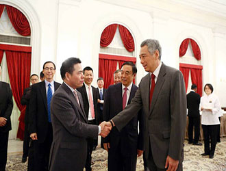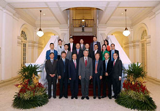 新加坡总理李显龙(中)与蒋锡培、马蔚华等中国企业家俱乐部成员合影